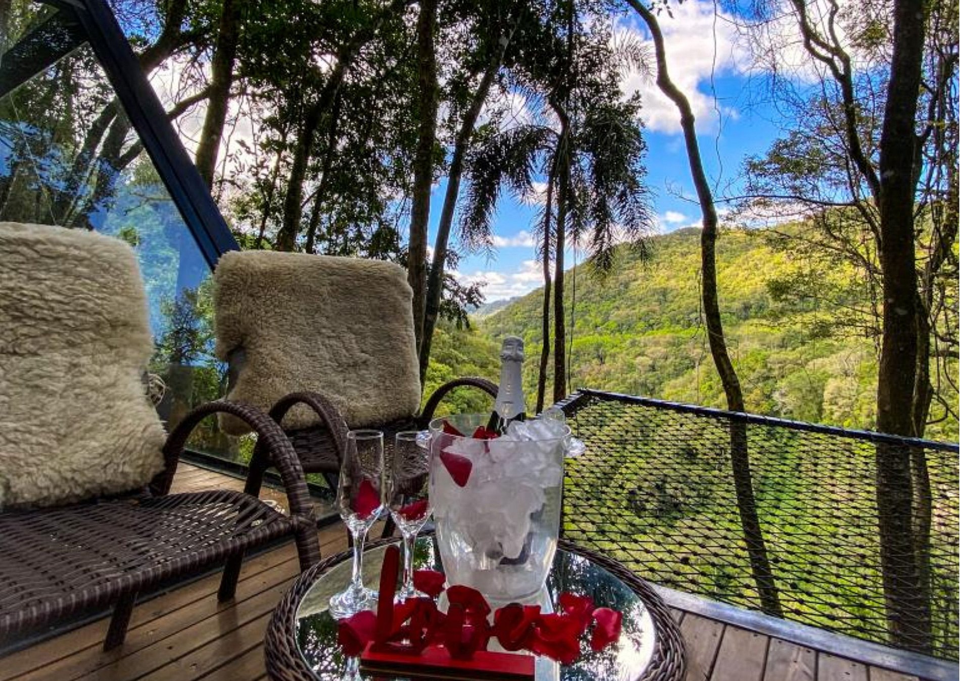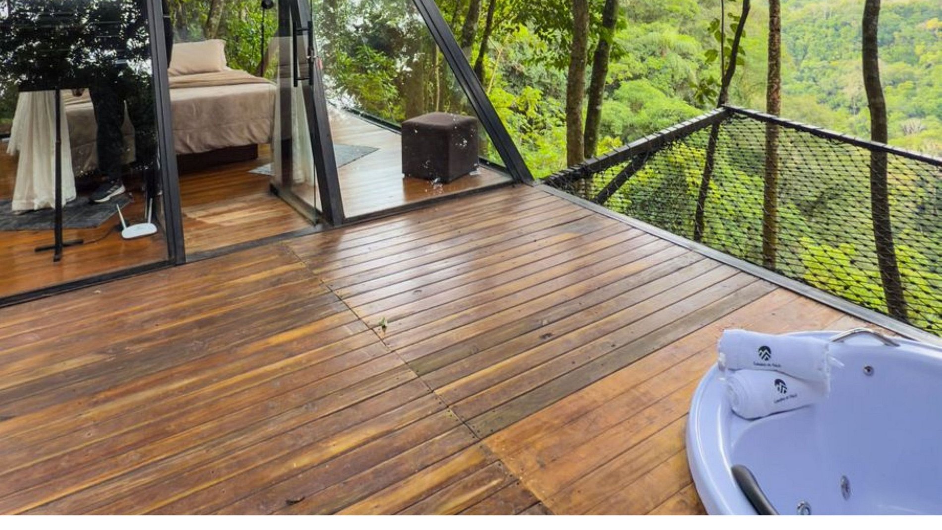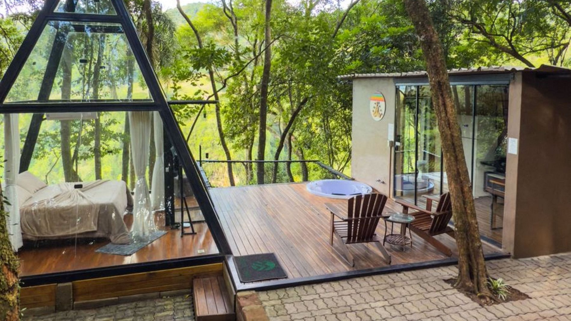 Dentro da pirâmide está apenas a cama, o ar condicionado e a tv smart, Caso prefira mais privacidade pode fechar as cortinas, porém ela é bem isolada e as principais companhias são os passarinhos e a natureza. Mas, pensamos em tudo, a pirâmide conta ainda com um banheiro com uma vista incrível para a mata, já que uma das paredes é totalmente de vidro, um deck com um charmoso ofurô com aquecimento.